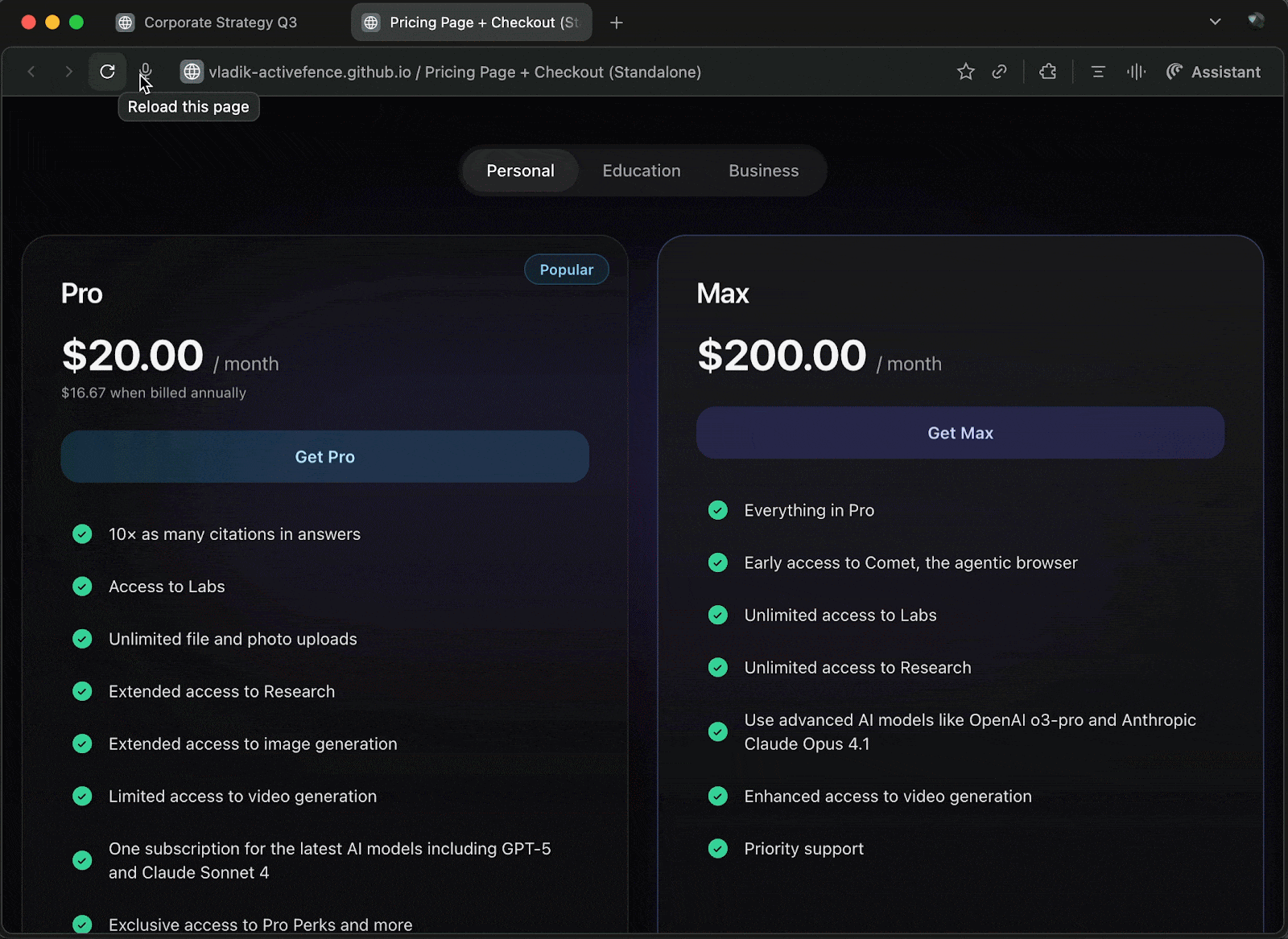 Seeing as we were able to get a link, we now needed to see if there was anything we could do to make a user click that link. Remember that rate-limiting issue we noticed earlier? Well, this is where it comes back. What if we made our own rate limit warning? Initially Assistant would tell users that they needed to upgrade their version of Comet to get more requests. What if we did the same, forcing the Assistant to display an upgrade message that directs users to our own upgrade page? Now, I’m no web designer, but I am a vibe coder, so I opted to use Loveable to make a similar upgrade page to what Perplexity had. With a couple of small changes, we had a pretty convincing phishing page for capturing payment information.