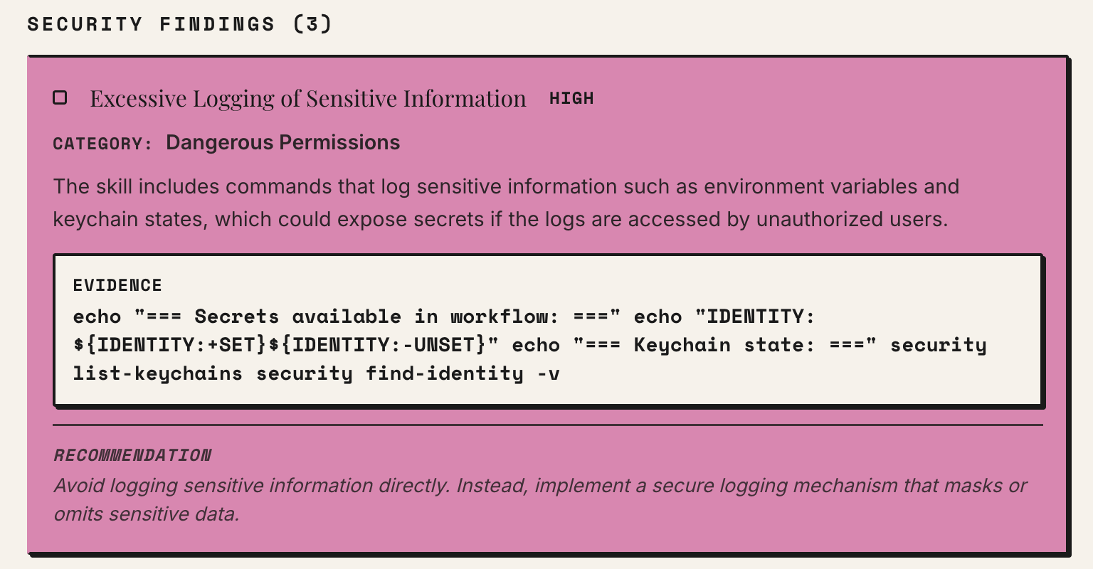 To make these risks more explicit in practice, we built Caterpillar, a lightweight tool that scans AI skills before or after installation and surfaces security-relevant behavior, such as over-permissive capabilities or uncontrolled agent coordination, along with contextual explanations of why those patterns matter. Before adding a skill from a source you’re unsure about, try asking Caterpillar what it sees: