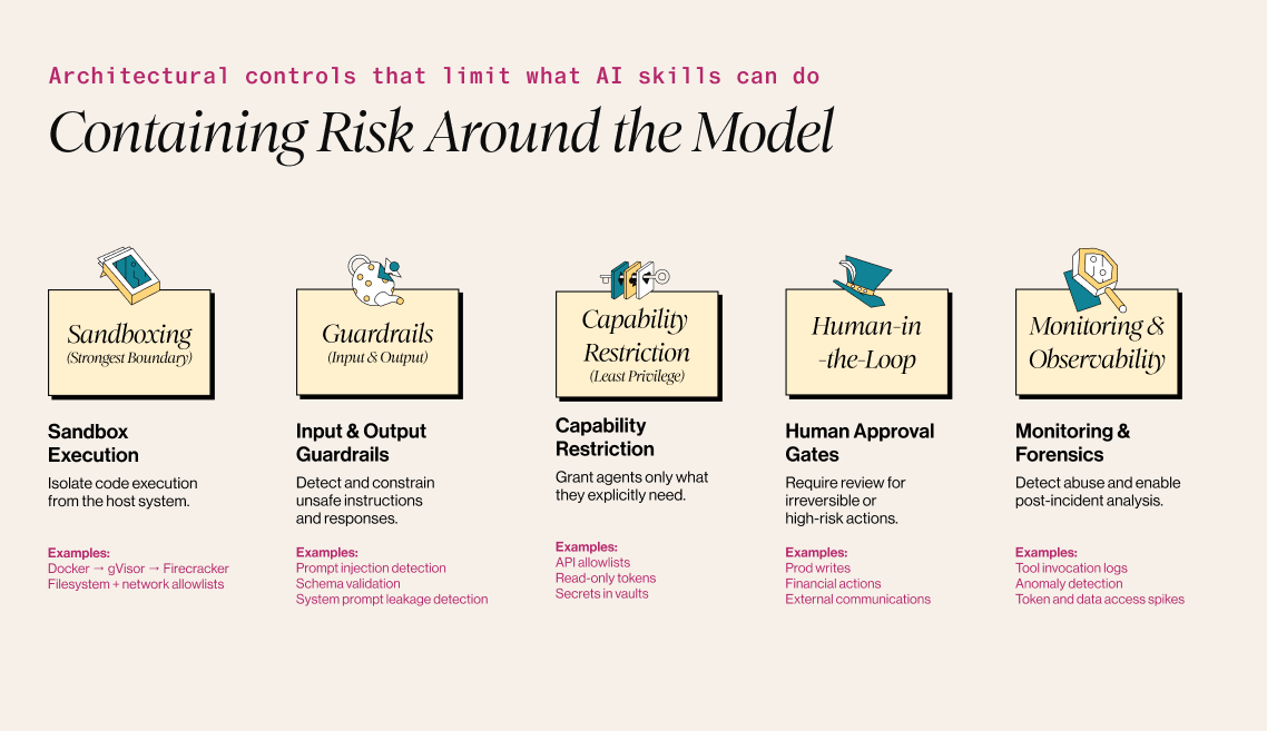 - Monitoring and observability enable detection and forensics. Log all agent operations and tool invocations with parameters. Use eBPF for kernel-level observation of AI workflows. Detect anomalous tool use patterns, unusual data access, and token consumption spikes.
