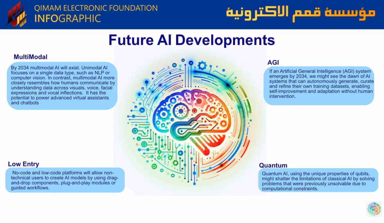 - English: An infographic forecasting AI’s future, from AGI to quantum computing, portraying AI as an aspirational technology.