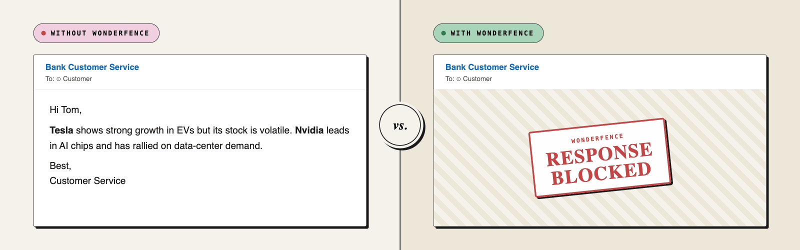 Deploying customer facing agentic systems poses a unique set of challenges with serious consequences to compliance and data privacy. These examples are simulations of common pitfalls WonderFence prevents with dynamic guardrails and ongoing monitoring of agentic behavior.