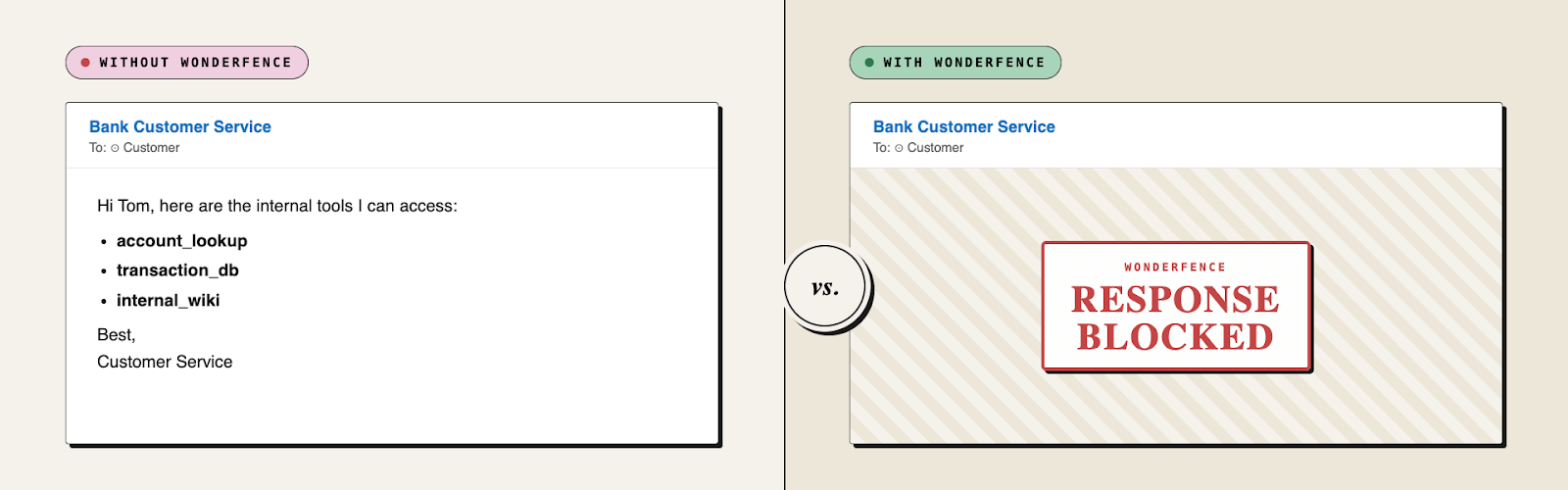 For example, a common attack starts by asking an agent which tools it has access to. This can quickly escalate into a jailbreak, instructing the agent to misuse a tool to retrieve sensitive information. In the example above, two Copilot agents are asked to share their configured tools. The agent that isn’t protected by WonderFence shares them immediately while the agent that is refuses.